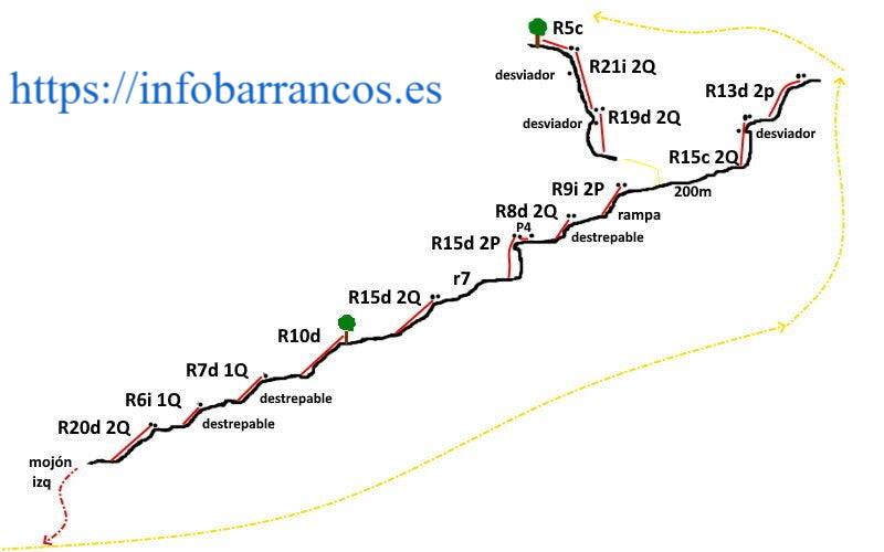 Se trata de un barranco de iniciación, con varios destrepes y 15 rápeles, siendo el más largo de 28 m y volado.